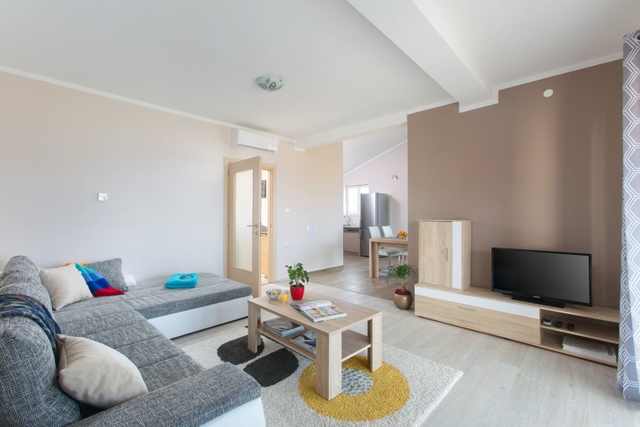 Das Ferienhaus bietet Platz für 6 Personen und eignet sich perfekt für Familien. Das geräumige Erdgeschoss mit Küche, Wohn- und Esszimmer bietet einen schönen Blick auf den Pool-Bereich und die Adria in der Ferne. Des Weiteren befindet sich ein Schlafzimmer mit Doppelbett und en-suite Badezimmer im Erdgeschoss. Im Obergeschoss befinden sich zwei weitere Schlafzimmer mit en suite Badezimmer. Ein Schlafzimmer ist mit Doppelbett und das andere mit zwei Einzelbetten ausgestattet. Zudem verfügt das Ferienhaus über eine kleine separate Taverne mit Kamin und Küche für gesellige Abendstunden mit Freunden oder der Familie.