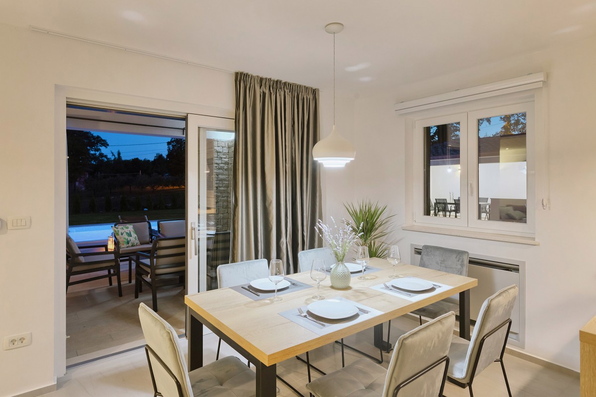 Dieses moderne Ferienhaus befindet sich in Breg, einem kleinen Dorf in der Nähe von Labin, oberhalb des Küstenortes Rabac, an der Ostküste der Halbinsel Istrien. Es liegt idyllisch im Grünen, am Ende einer Sackgasse, so dass Sie sich hier völlig ungestört fühlen und Ihre Privatsphäre genießen können.