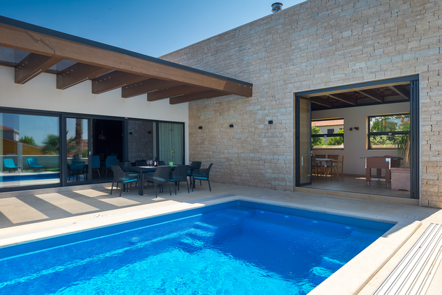 Diese moderne Ferienvilla liegt in Pula, an der Südwest-Küste der Halbinsel Istrien. Die ebenerdige Villa wurde im Jahr 2018 neu erbaut und beherbergt zwei Wohnbereiche, die als eine Einheit vermietet werden. Alle Räume sind dahingehend konzipiert worden, dass Sie Ihre Urlaubstage gemeinsam mit Freunden und Familie genießen können. Das Objekt bietet Ihnen aber auch zugleich individuelle und räumliche Freiräume.