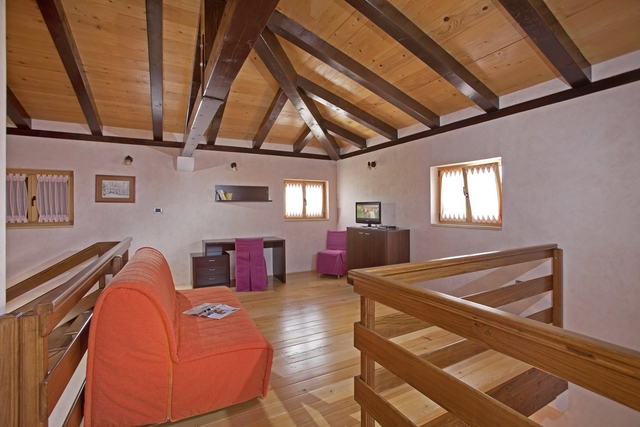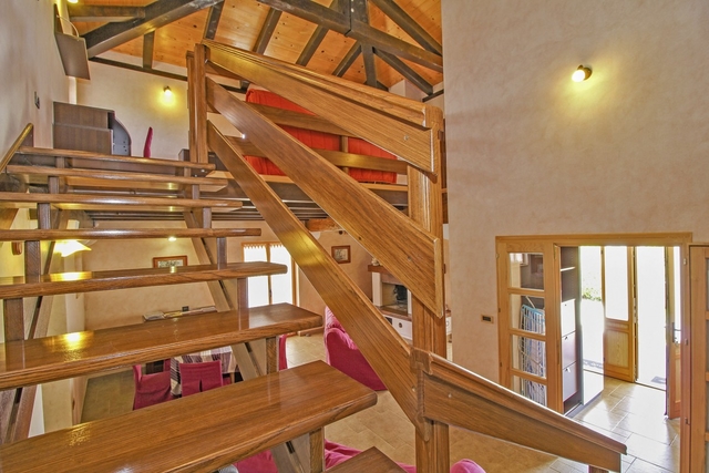 Im Erdgeschoss befindet sich ein geräumiger Wohnraum mit offener Küche, Essbereich, Klimaanlage und Kamin, ein Schlafzimmer mit Doppelbett, Klimaanlage und eigenem Bad/WC, ein Schlafzimmer mit zwei Einzelbetten, Klimaanlage und eigenem Bad/WC, ein separates WC, zwei Terrassen. Im ersten Stock offene Galerie mit Schlafcouch für zwei Personen (180 x 190 cm), Klimaanlage und ein weiteres Badezimmer mit Badewanne und WC. Vom Wohnbereich haben Sie Zugang zu den überdachten Terrassen und dem Garten.