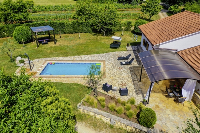 Dieses Ferienhaus befindet sich im kleinen Ort Krajcar Brig, ca. 5 km von Žminj entfernt, im grünen Landesinneren der Halbinsel Istrien.