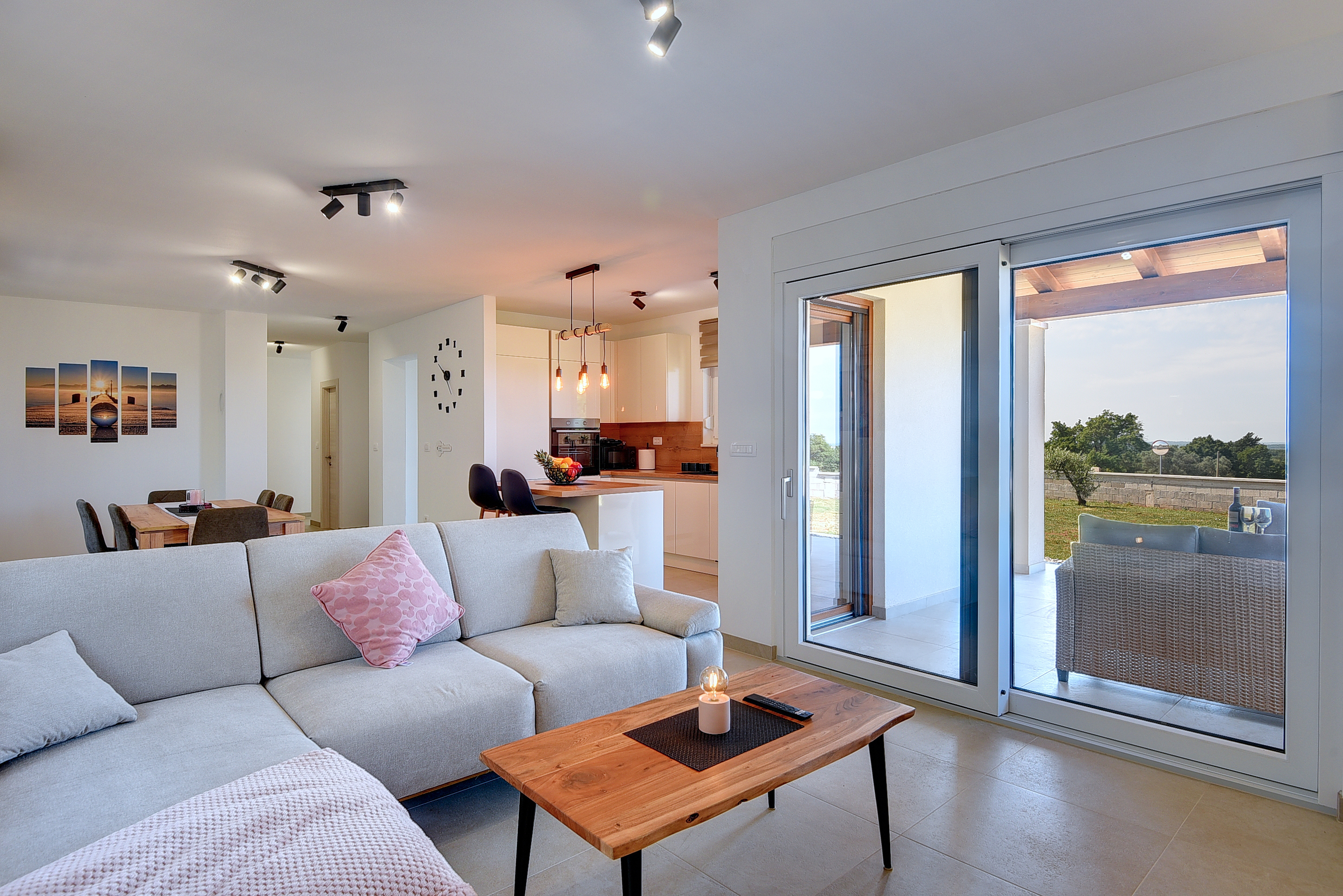 Fliesen, Klimaanlage, offener Wohn- und Essbereich mit Küche, Sat-TV, Sofa, Terrassenzugang