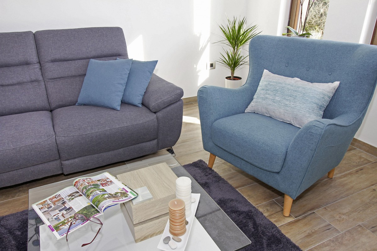 Das Ferienhaus bietet auf zwei Etagen Platz für 10 Personen. Im Erdgeschoss befinden sich zwei Doppelzimmer, ein Einzelzimmer, eine Küche mit Essbereich, ein Wohnzimmer, ein Badezimmer mit Dusche / WC und ein Badezimmer mit Badewanne / WC. Das Wohnzimmer und die Küche verfügen über eine Klimaanlage. Die erste Etage wird für die Saison 2019 neu eingerichtet und bietet einen klimatisierten Wohnraum mit Küche und Essbereich, zwei Doppelzimmer, ein Einzelzimmer, zwei Badezimmer mit Dusche / WC und eine überdachte Terrasse (ca. 12 m²). Zu dem Erdgeschoss gehören zwei weitere große Terrassen und ein Grillkamin.