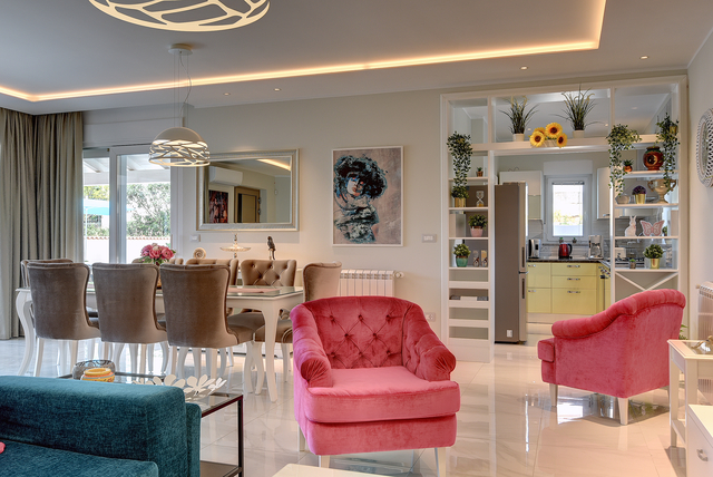 Das Ferienhaus bietet Platz für 8 (+1) mit vier Schlafzimmer, vier en suite Badezimmer und ein separates Bad. Der Wohn- und Essbereich mit Küche ist offen angelegt und bietet ein modernes und luftiges Wohngefühl. Das Interieur ist in hellen Farben gehalten und mit farbenfrohen Möbeln eingerichtet.